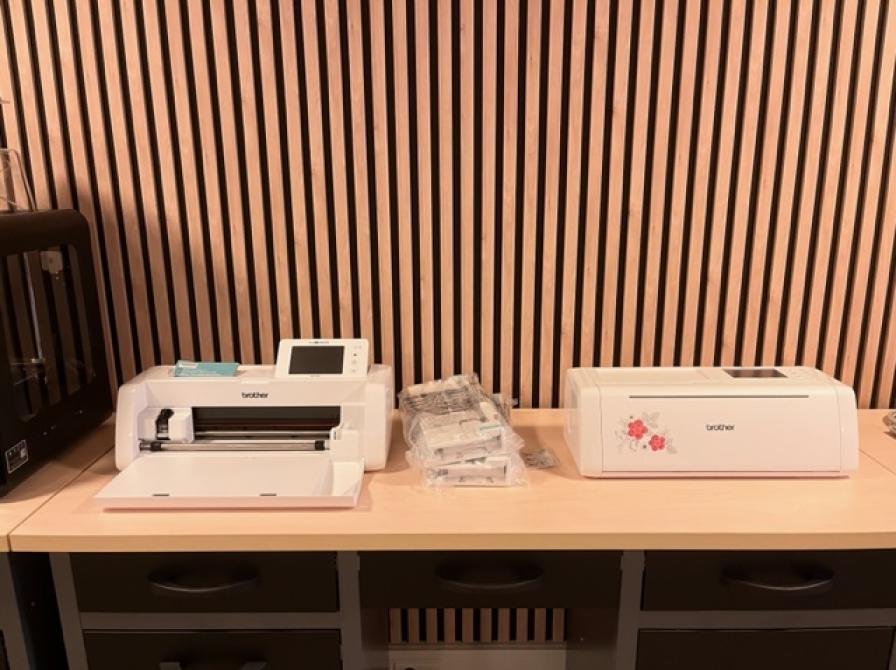 Maskinerne: Scan 'n' cut SDX1250 er en vinylskære, der blandt andet kan skære i folie til tryk eller ophæng. Du har fx lave et logo til et skilt eller en t-shirt. Du kan enten skære i almindeligt vinyl til opklæbning eller vinyl til varmpressen, der kan overføres til tøj. Derudover kan du printe klistermærker på storformatsprinteren, som skal skæres ud og derefter er klar til brug.